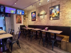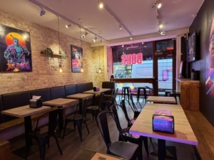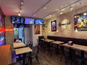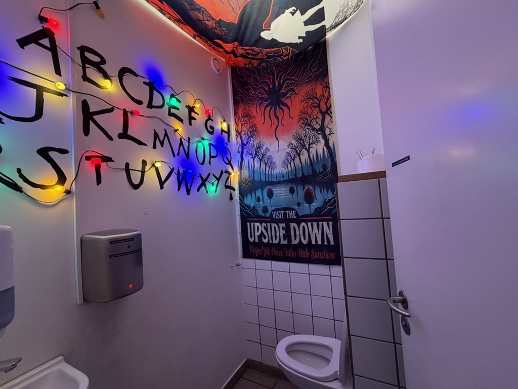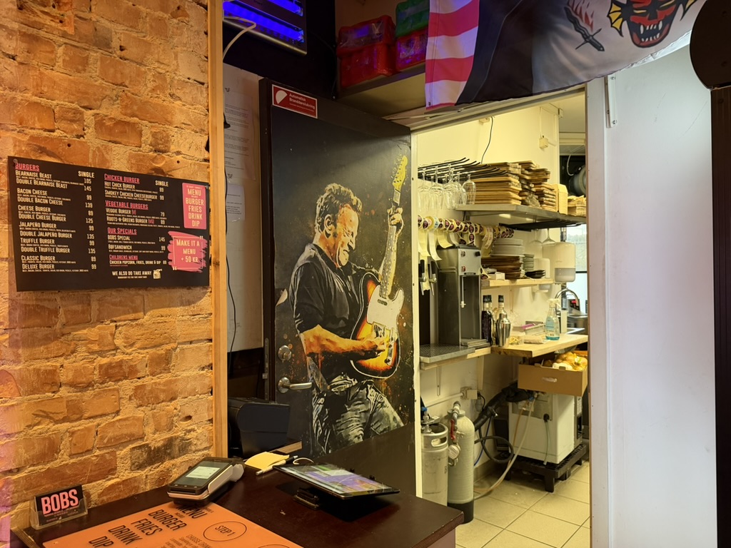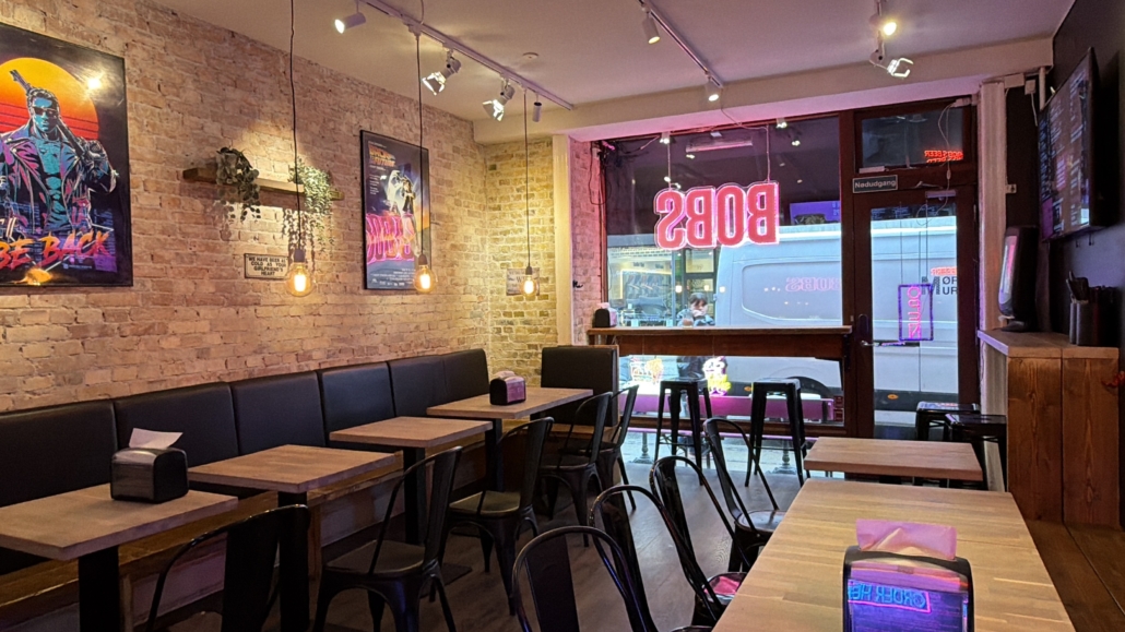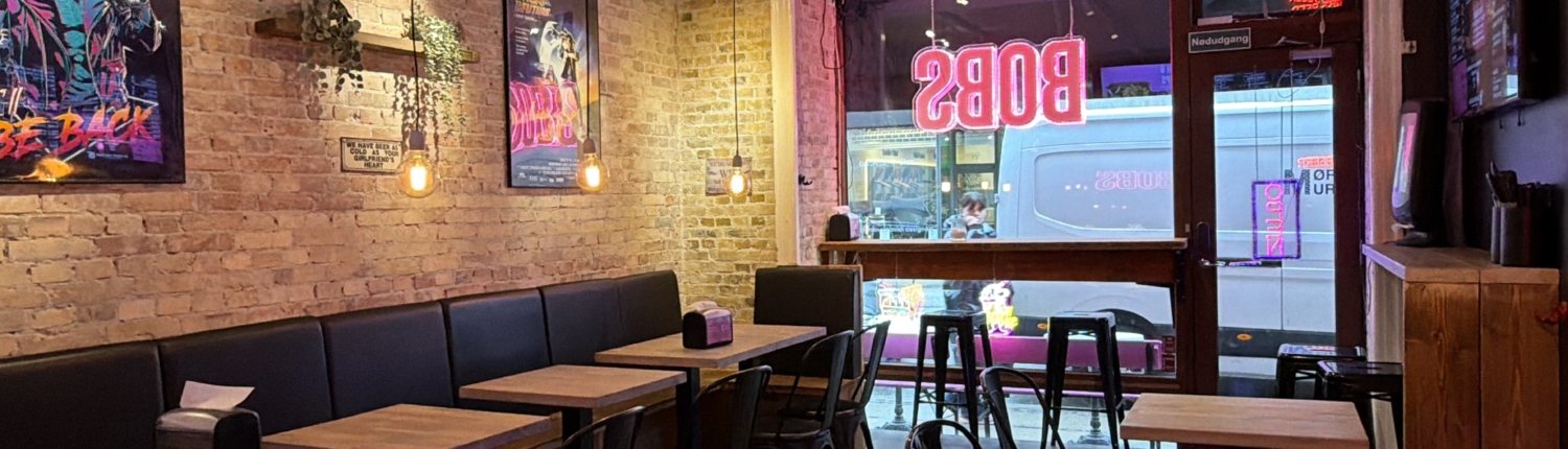 Restauranten fremstår med en gennemført og charmerende 80’er-inspireret indretning med farverigt inventar og iøjnefaldende vægdekorationer, som understøtter det uformelle og populære burgerkoncept. Stemningen er hyggelig og intim – et sted hvor gæsterne føler sig velkomne, hvad enten det er til en hurtig frokost eller en afslappet middag.