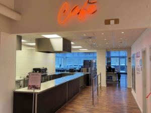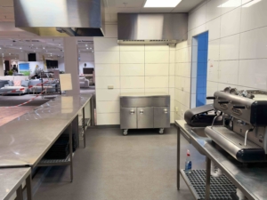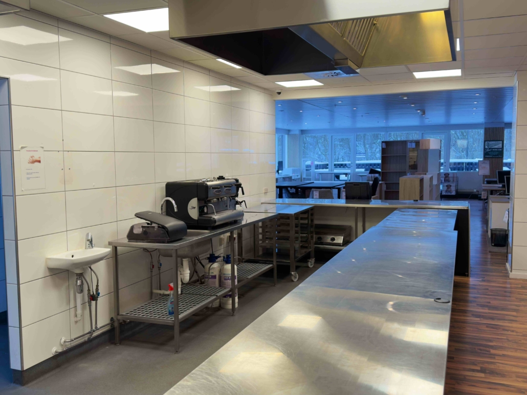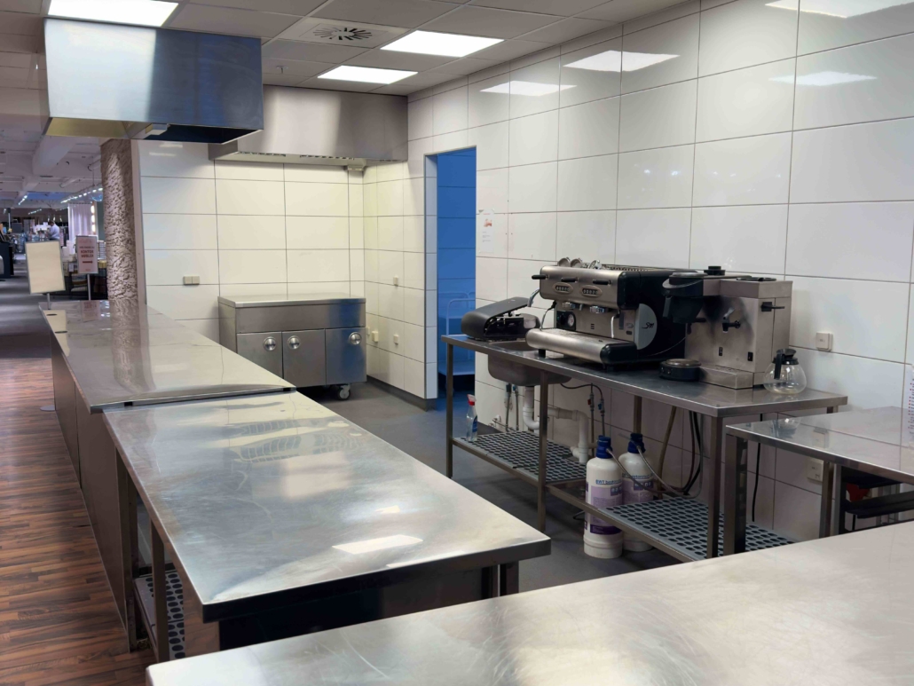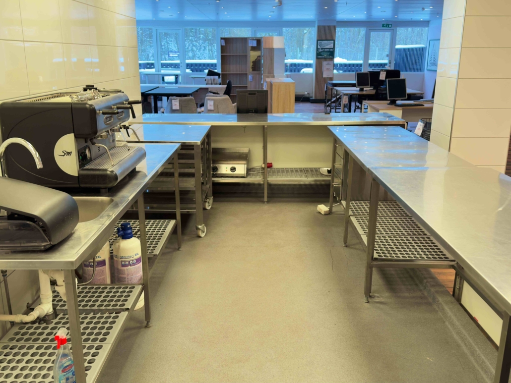 Caféen ligger i forlængelse af udstillingen, med åbent layout og lang serveringsdisk, synligt café‑skilt samt direkte kig til siddepladserne i caféen. Køkken er velindrettet med store rustfri arbejdsborde, kraftig udsugning, flere Gram‑køleskabe/frysere, opvaskestation med industriopvasker, håndvaske og rigeligt hylde- og rullebordsplads. Hele opsætningen fungerer perfekt til det meste som buffet, simple varme retter, sandwiches, kager og baristakaffe. Gæsterne kan sidde både inde i caféen og på udendørsarealerne.