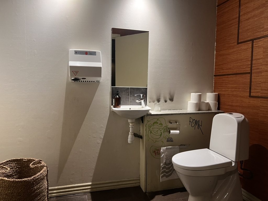 Der er flere pæne gæstetoiletter og der er lavet en lydsluse imod vejen.