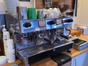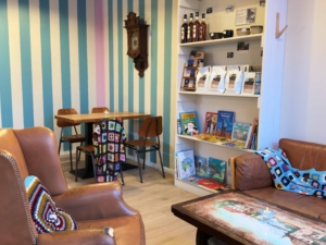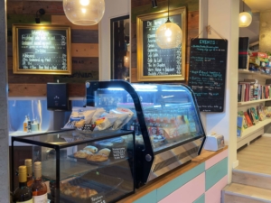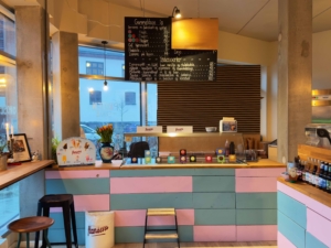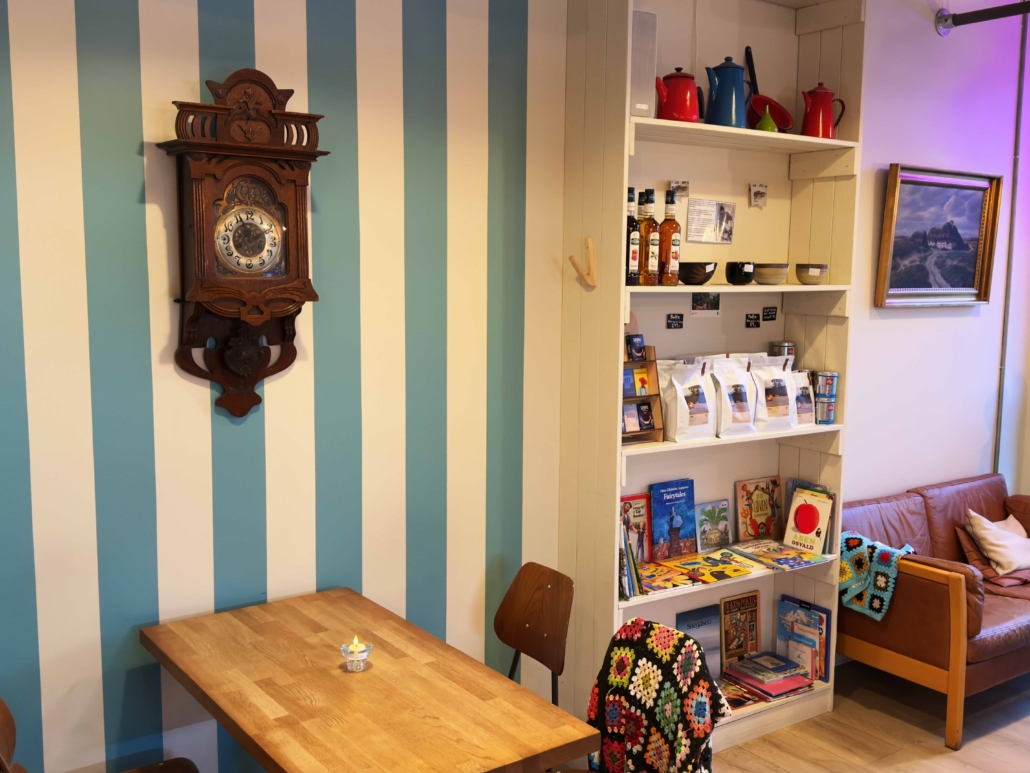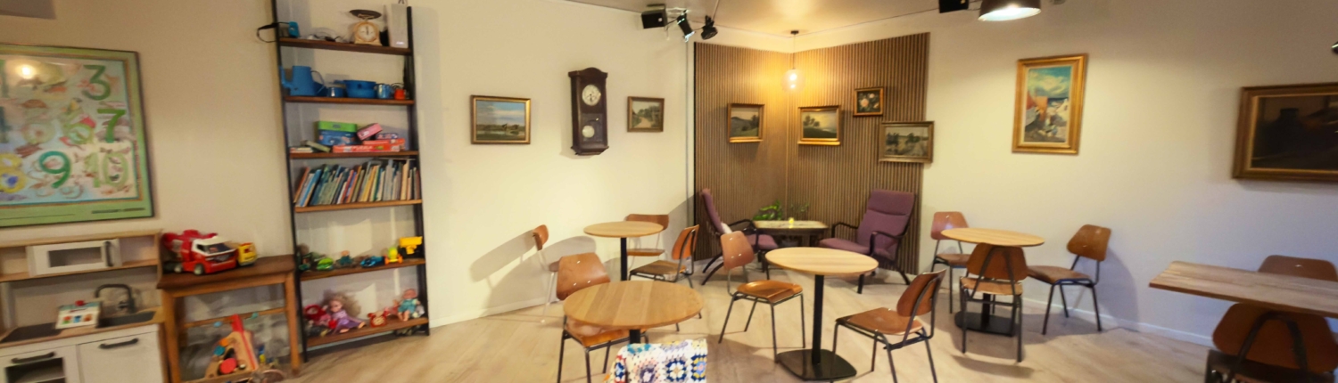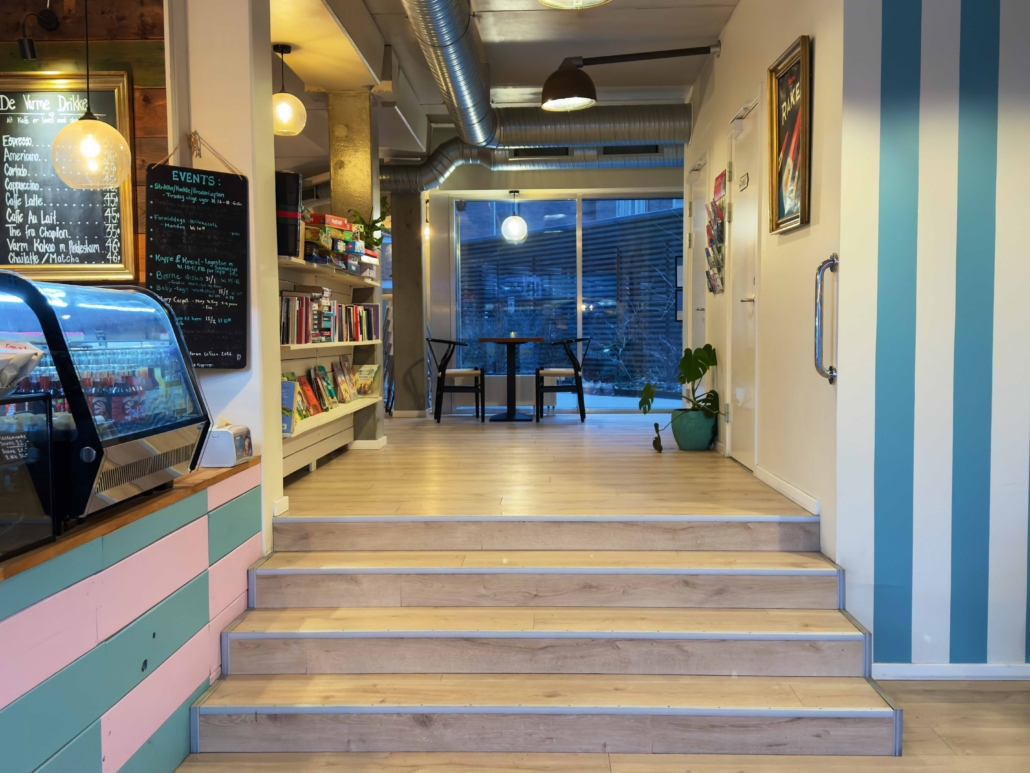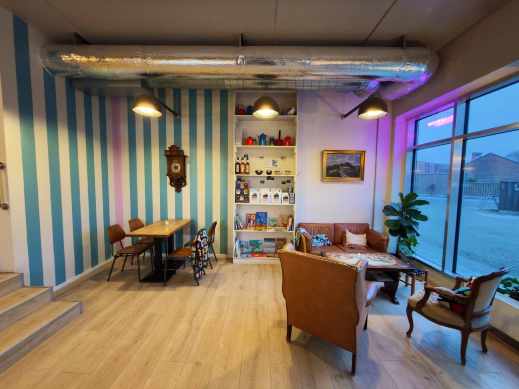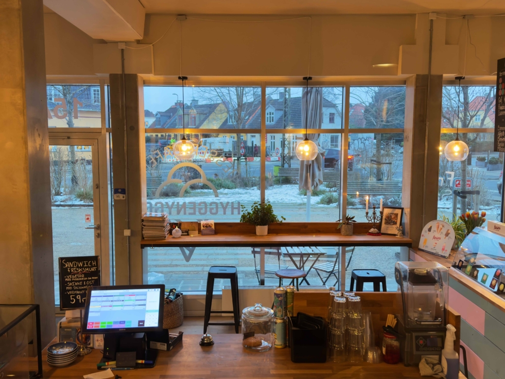 Lokalerne er nyrenoverede med ca. 140 m² fordelt på et plan i flere niveauer, caféen er indrettet med et hyggeligt og traditionelt cafézone, legeområde med hylder fulde af bøger og legetøj. Der er plads til 30-40 gæster ved de forskellige borde, sofaer, stole samt ved de store vinduer som har lys og udsigt.
