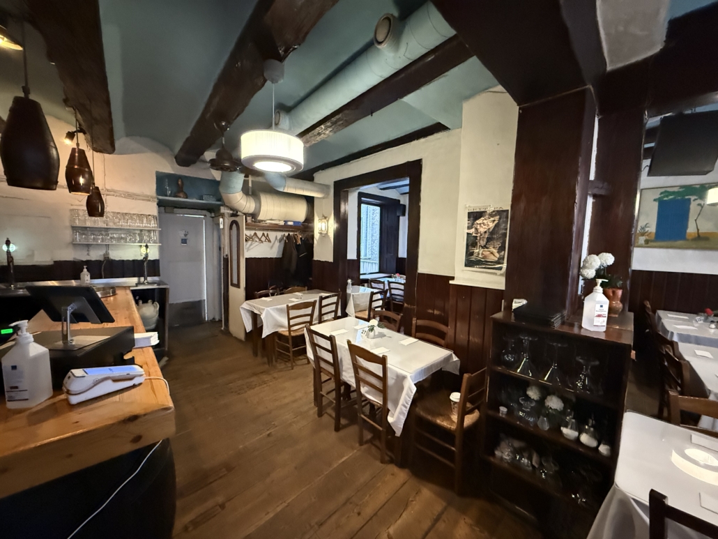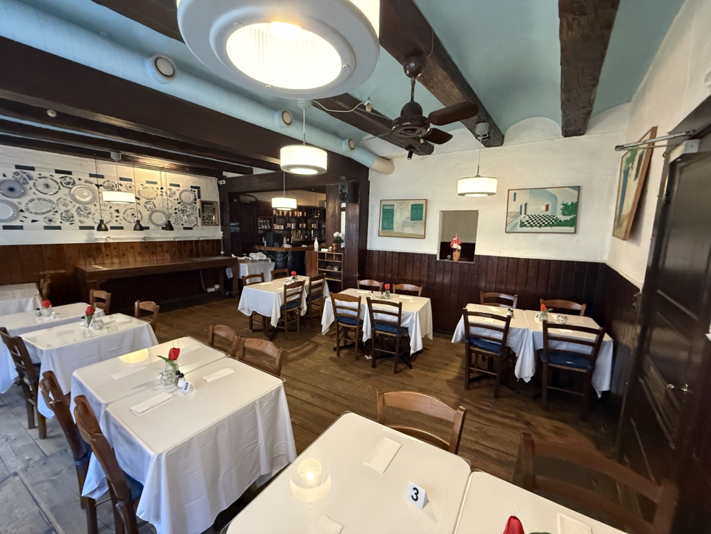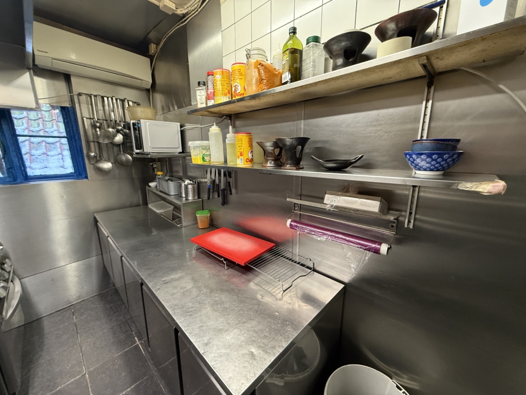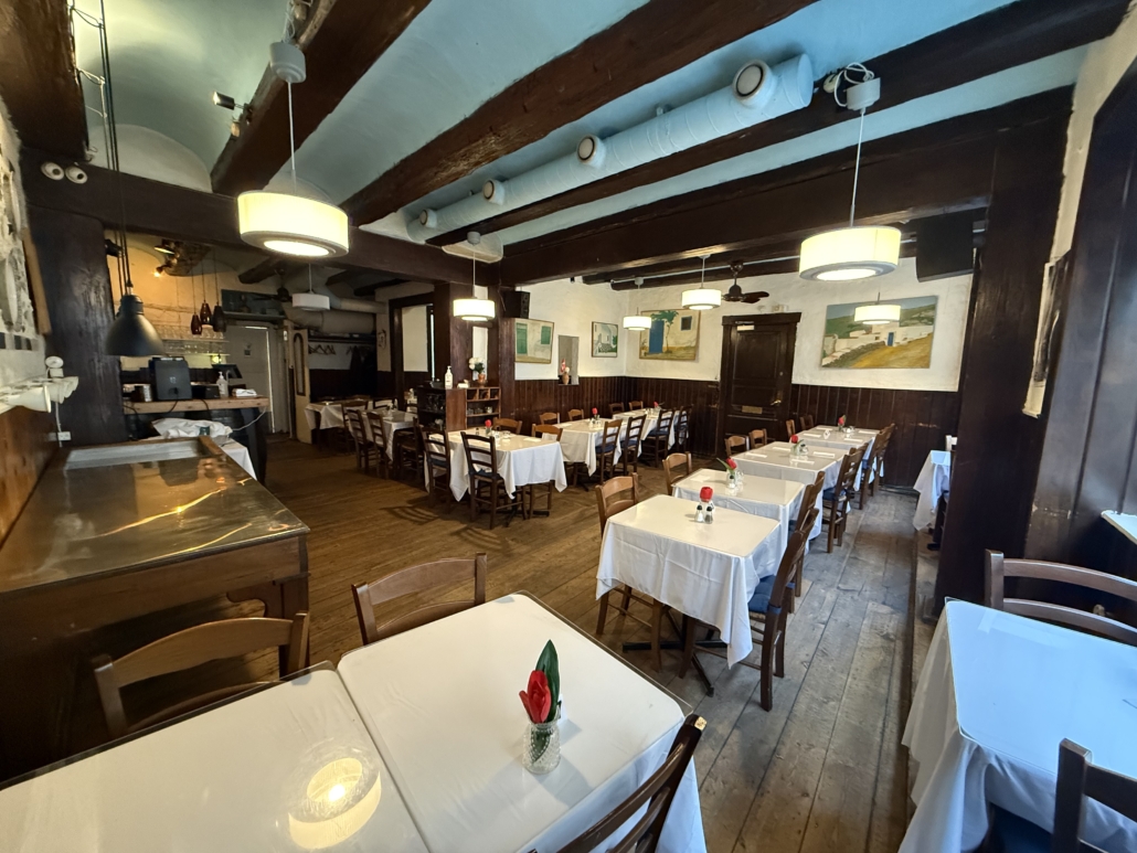 Lokalet ligger hævet 5 trin over gadeplan og åbner sig til et hyggeligt serveringsområde med bar og en varm, indbydende atmosfære. Her er plads til både à la carte-servering og intime private dining-arrangementer. Restauranten råder desuden over to pæne kundetoiletter samt et effektivt udnyttet køkken med zoner til prep, stegning, kogning og separat opvask.
