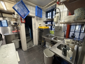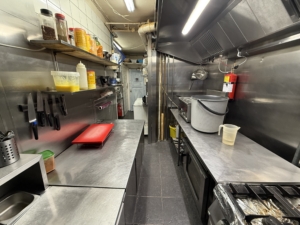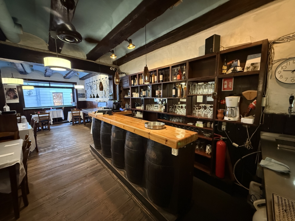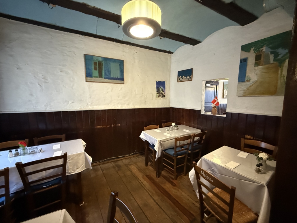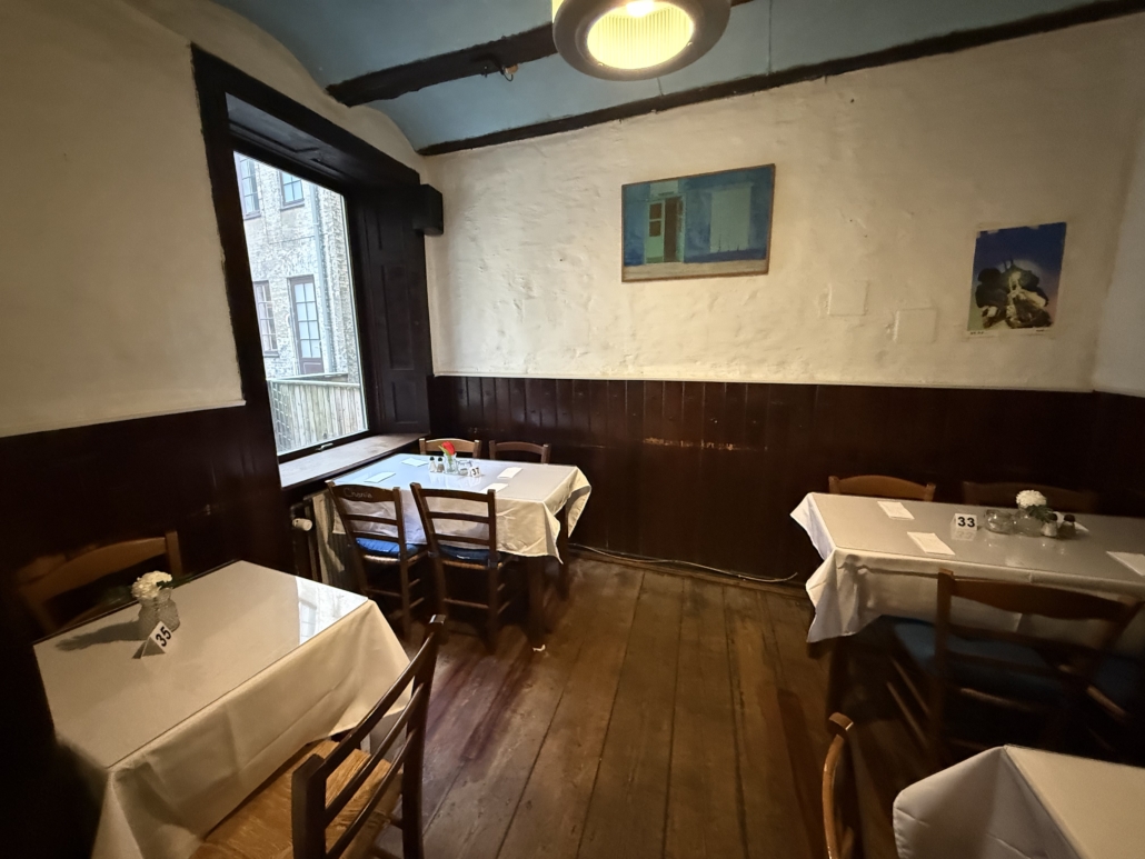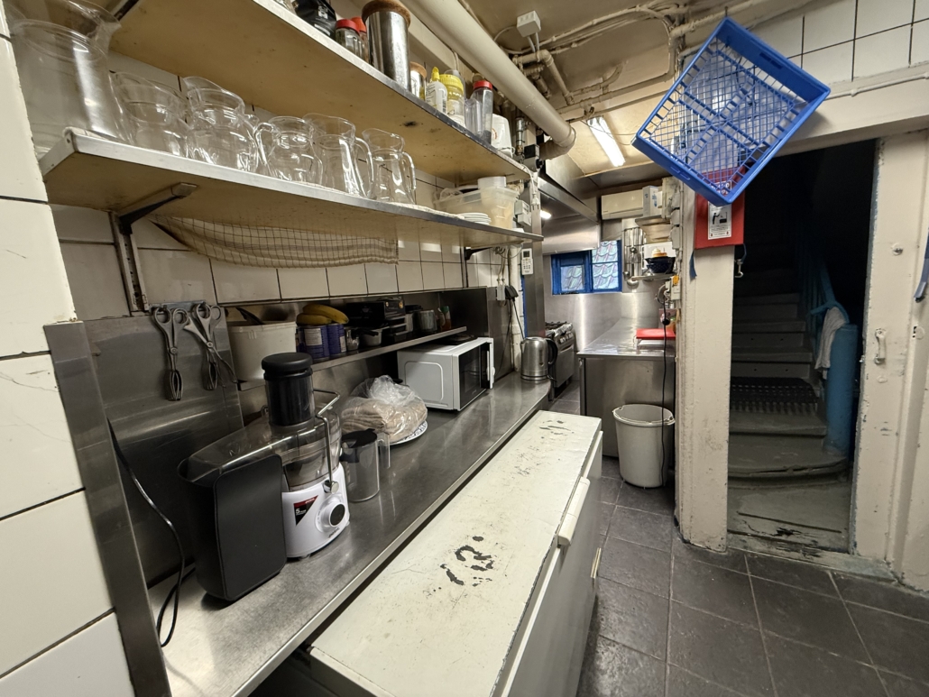 Lokalet ligger hævet 5 trin over gadeplan og åbner sig til et hyggeligt serveringsområde med bar og en varm, indbydende atmosfære. Her er plads til både à la carte-servering og intime private dining-arrangementer. Restauranten råder desuden over to pæne kundetoiletter samt et effektivt udnyttet køkken med zoner til prep, stegning, kogning og separat opvask.