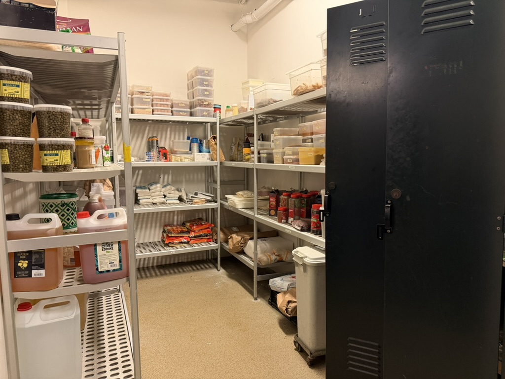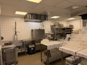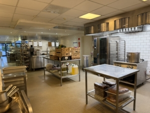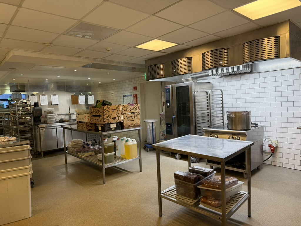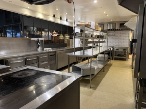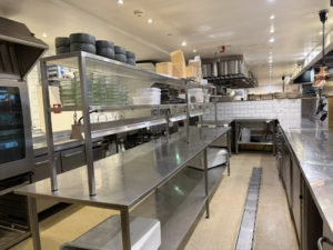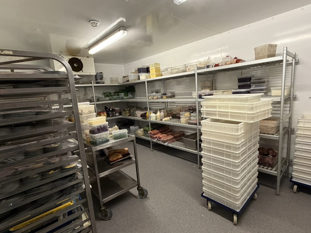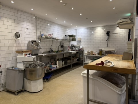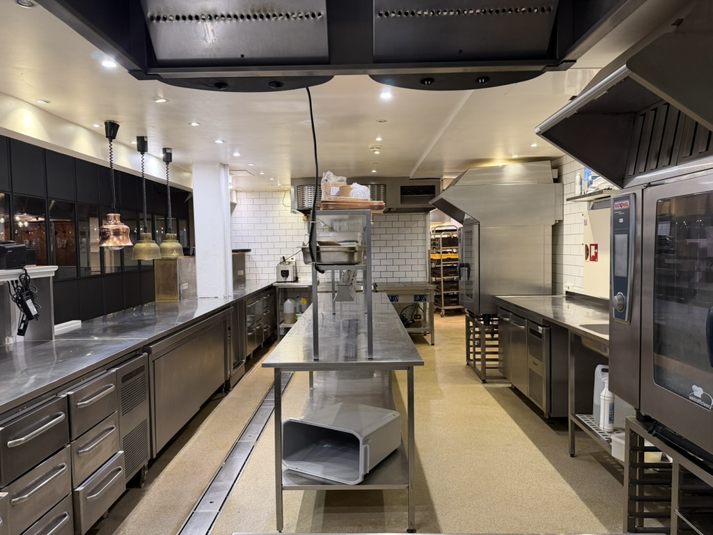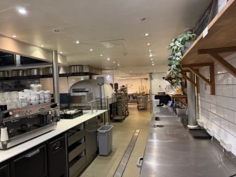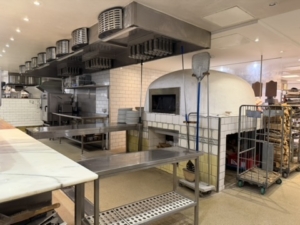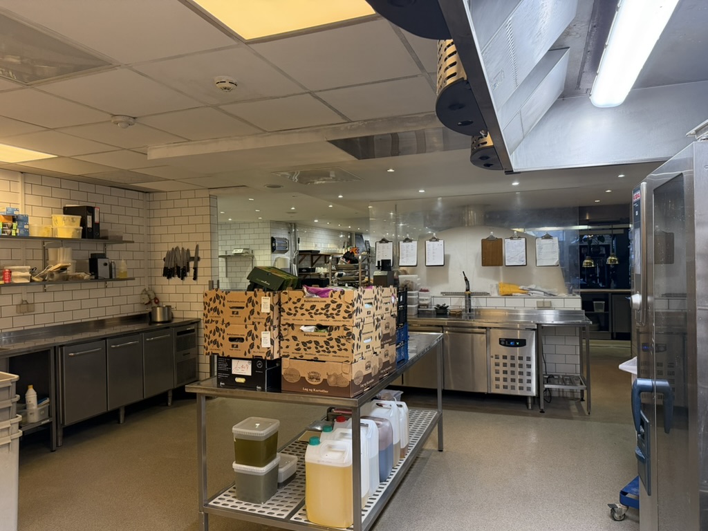 Bagtil findes et yderst veludstyret og professionelt produktionskøkken i stor skala. Køkkenet rummer bl.a. en markant pizzaovn placeret centralt i lokalet, flere produktionssektioner med både koldt og varmt køkken, store køle- og frysefaciliteter samt generøse opbevarings- og lagerarealer. Her er kapacitet og faciliteter til at servicere både restauranten og evt. ekstern produktion eller catering i hele Nordsjælland.