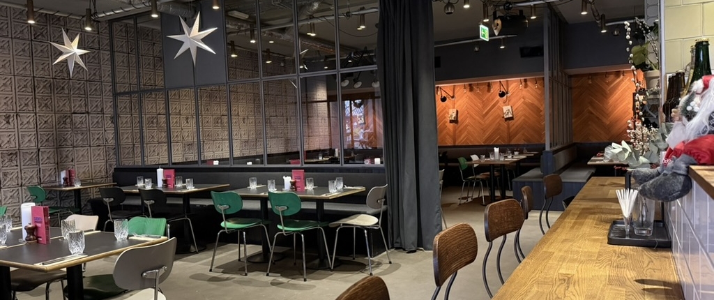 Ved indgangen mødes gæsterne af en stor og markant bar med rigelig arbejdsplads og et naturligt overblik over indgangspartiet og restaurantens puls – ideelt til både restaurant- og bardrift.