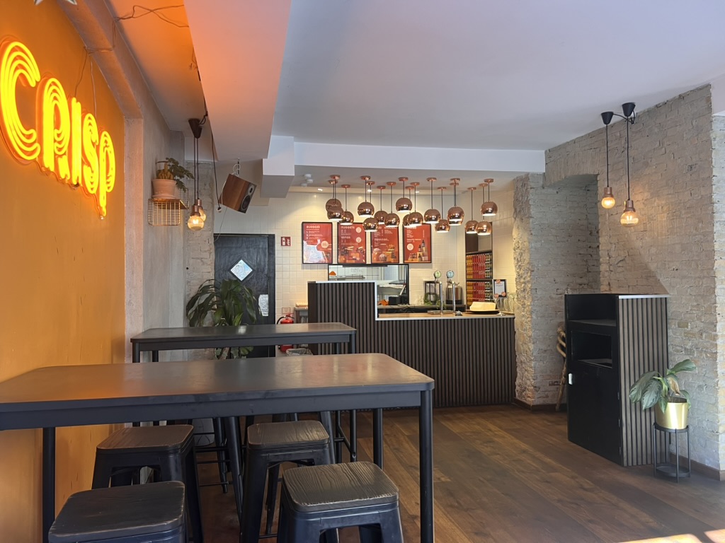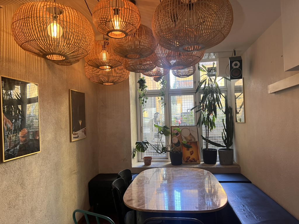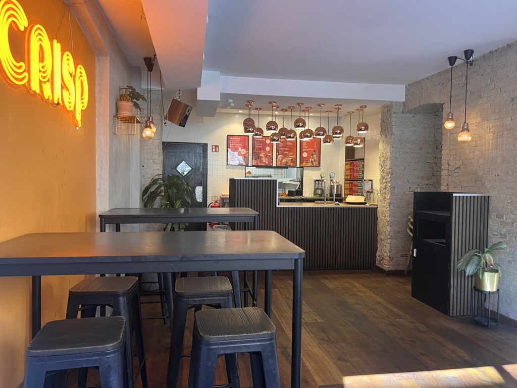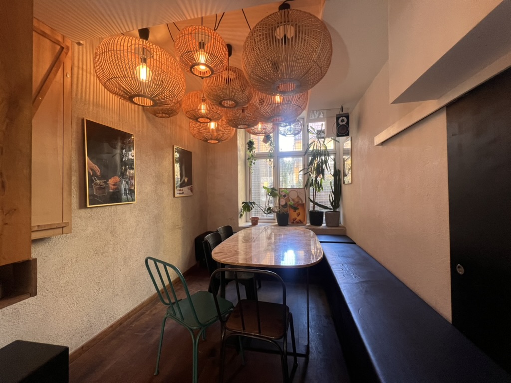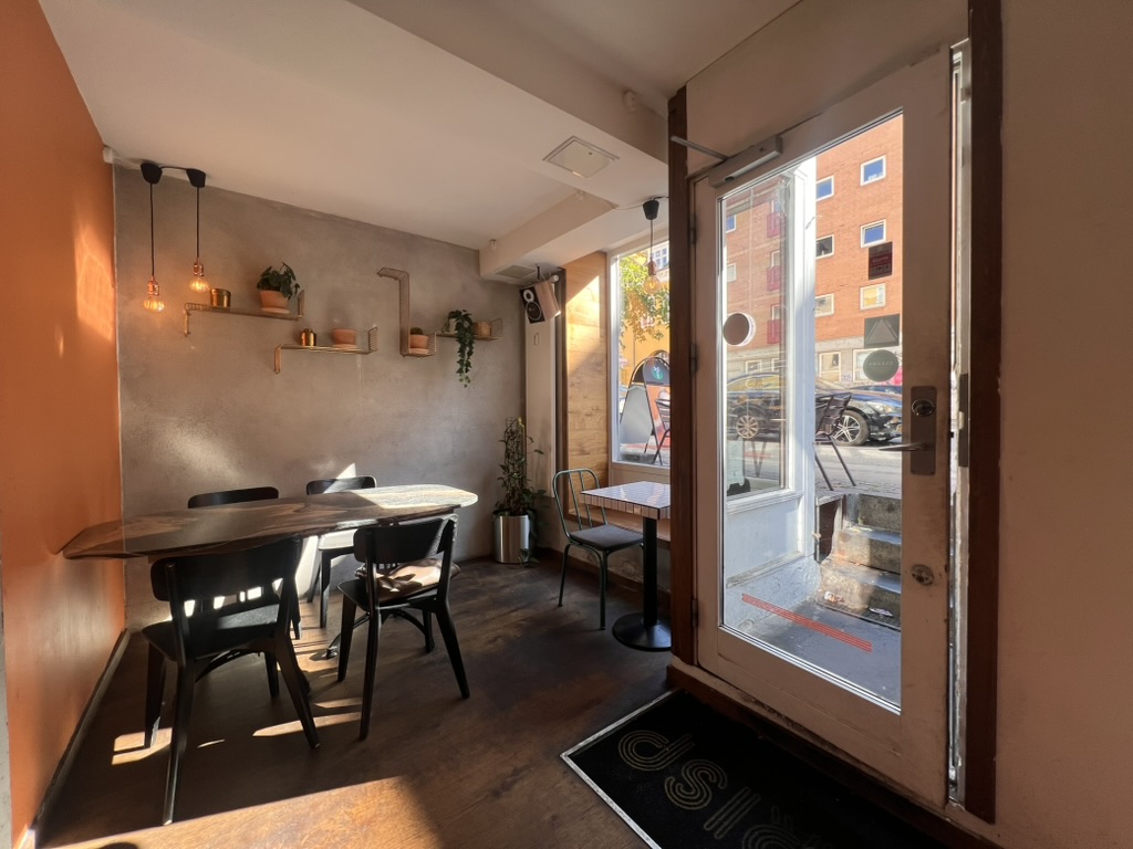 Lokalet byder på et lyst og indbydende serveringsareal, som er opdelt i flere hyggelige områder med et behageligt lysindfald fra de store facadevinduer. Her er skabt en intim atmosfære, der passer perfekt til både spisegæster på farten og dem, der ønsker at nyde et måltid i rolige rammer.