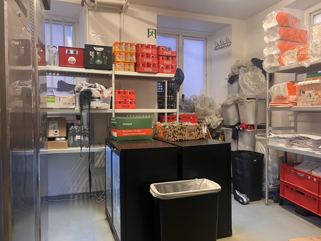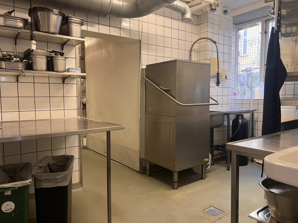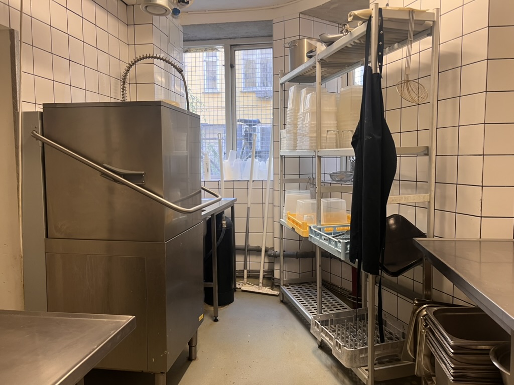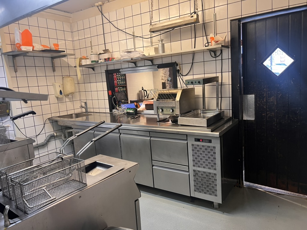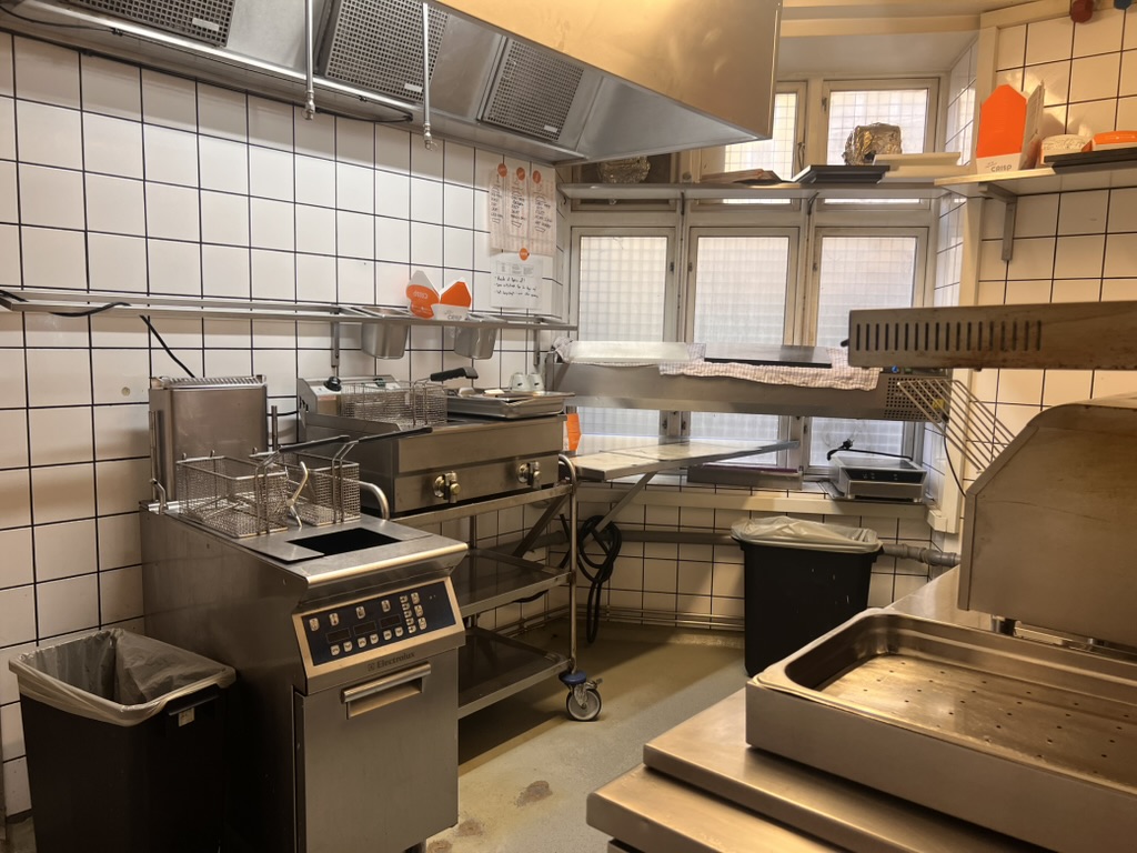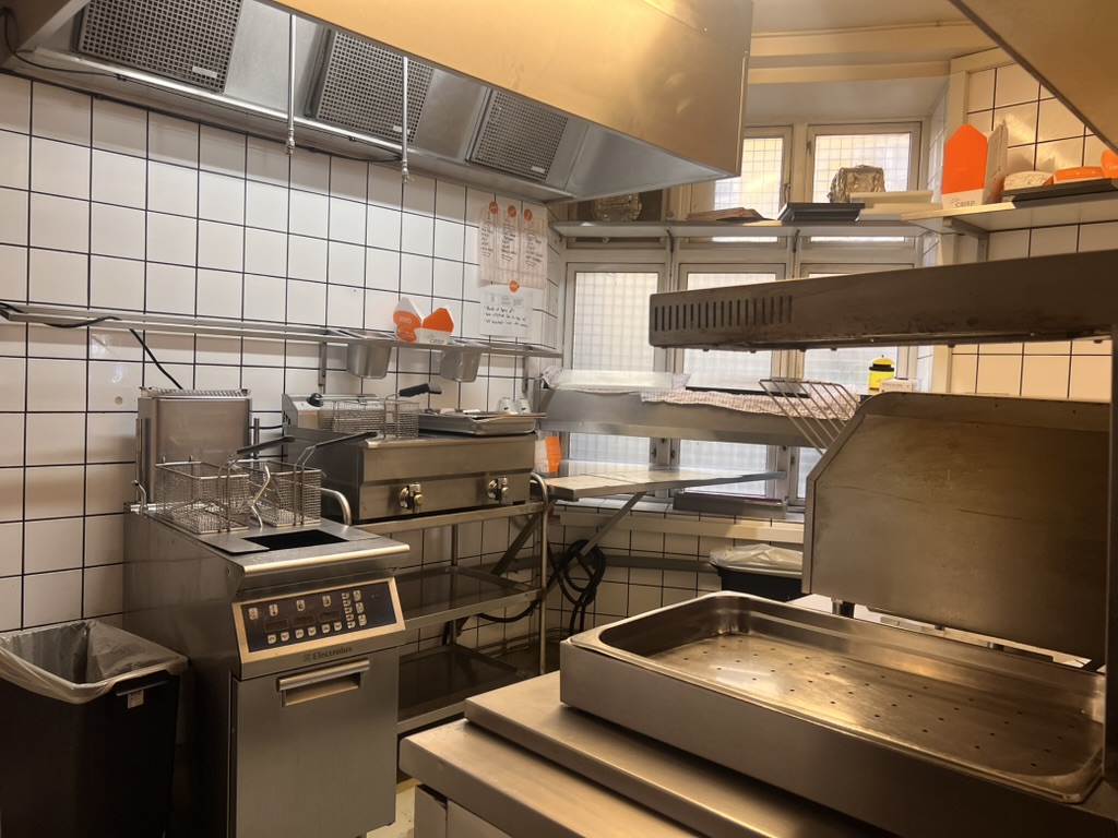 Køkkenet er indrettet som et moderne fast-food køkken og er praktisk disponeret med direkte forbindelse til restauranten, separat opvaskerum samt et rummeligt tørvarelager med rigelig kølekapacitet.