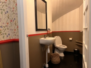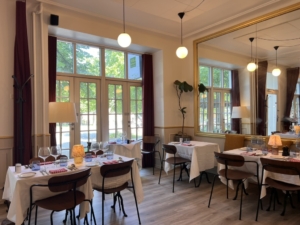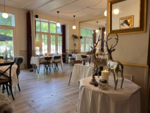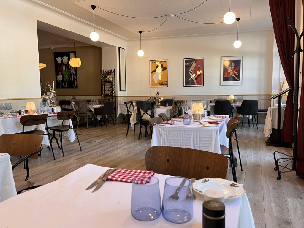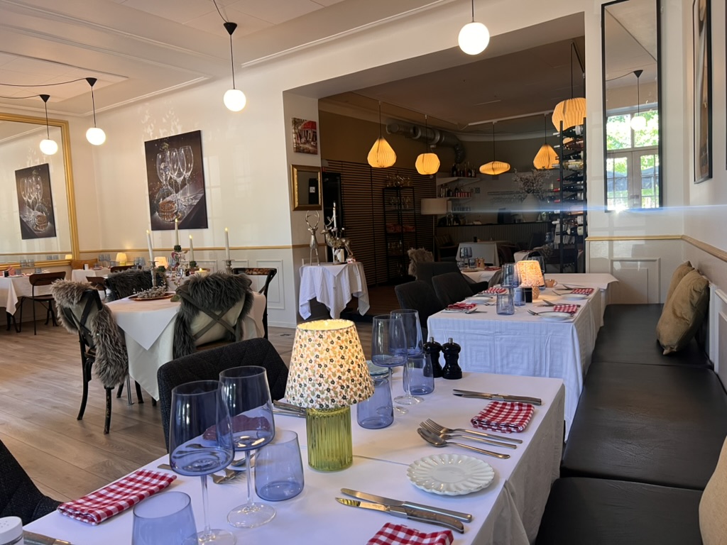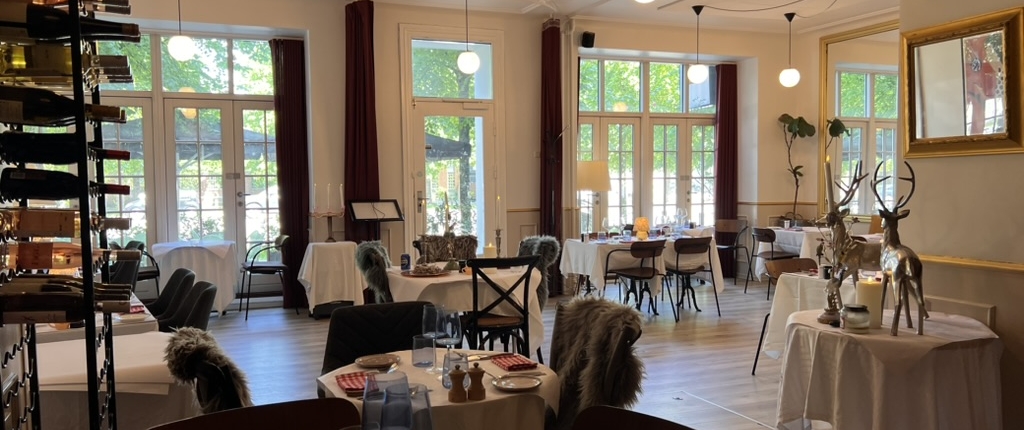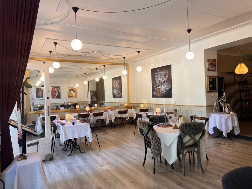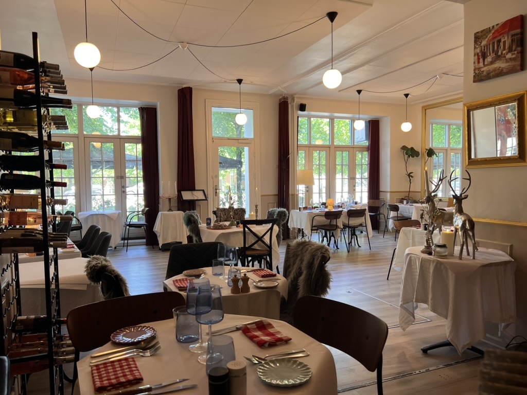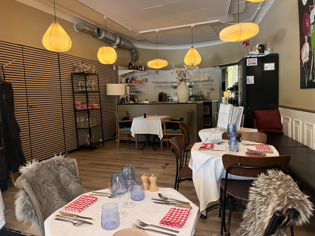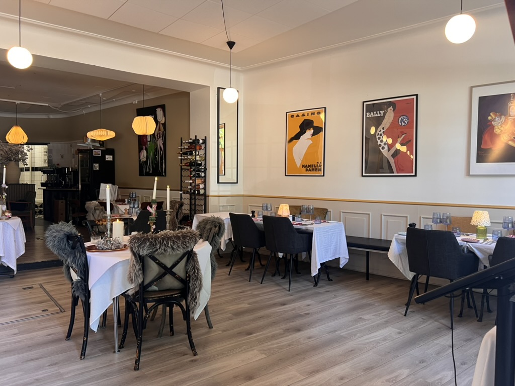 Indretningen er lavet i klassisk stil, der er højt til loftet og serveringsarealet er lyst med store franske skydedøre, der kan slåes helt op.