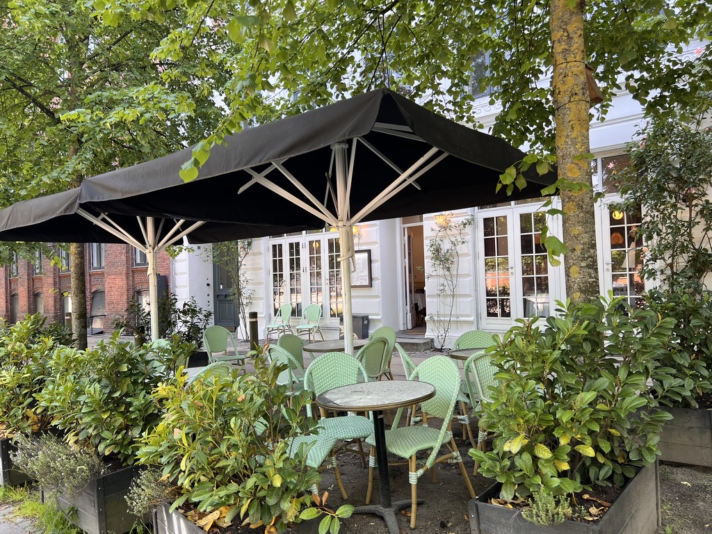 Foran restauranten er der en hyggelig grøn terrasse med 20-30 siddepladser i solen.