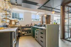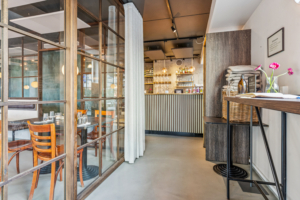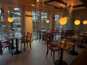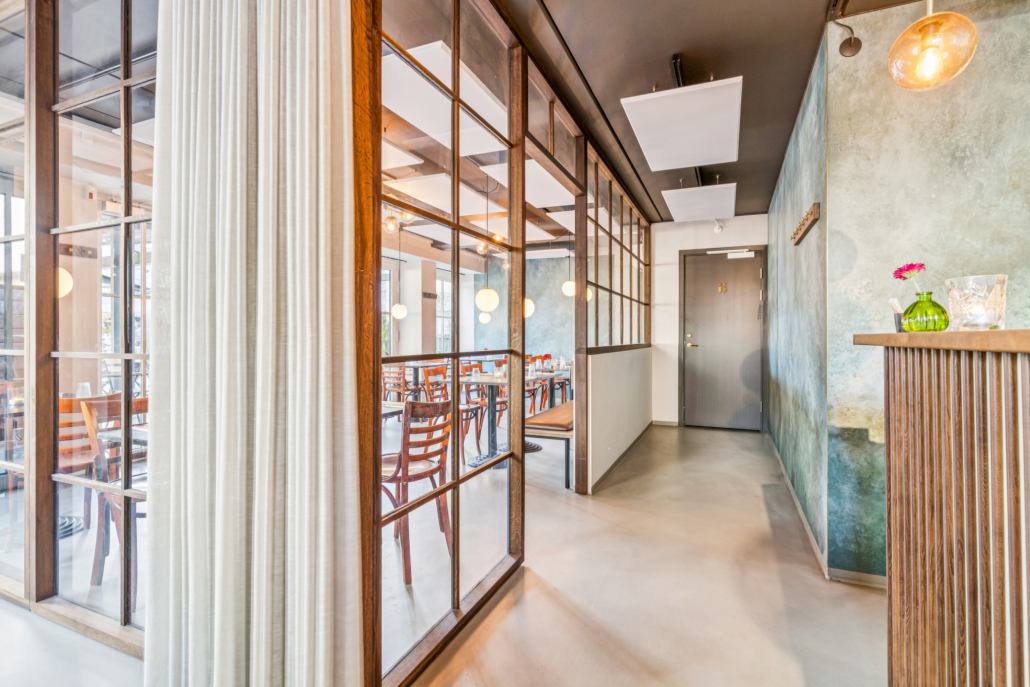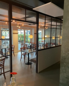 Lokalet byder på en enkel, stilfuld indretning med et fantastisk lysindfald fra den brede glasfacade. Her kan dørene åbnes direkte ud mod den store terrasse, hvilket skaber en smuk og naturlig overgang mellem inde og ude. Stemningen indenfor er både varm og indbydende – et sted, hvor gæster straks føler sig hjemme.