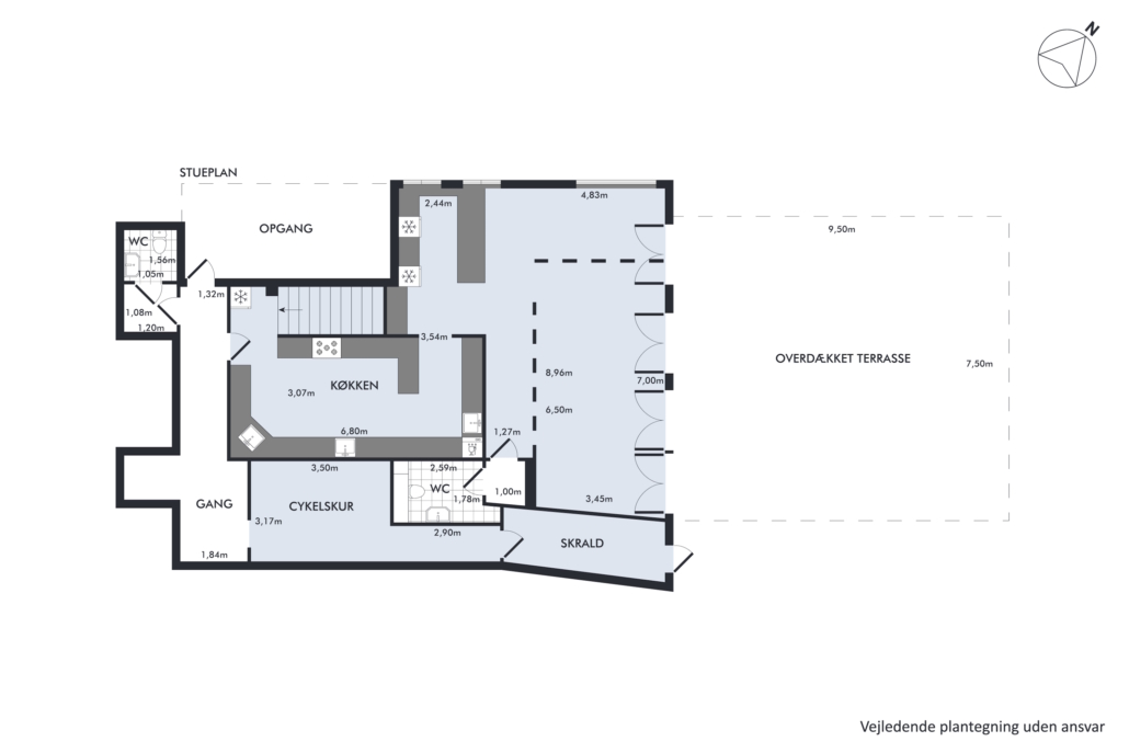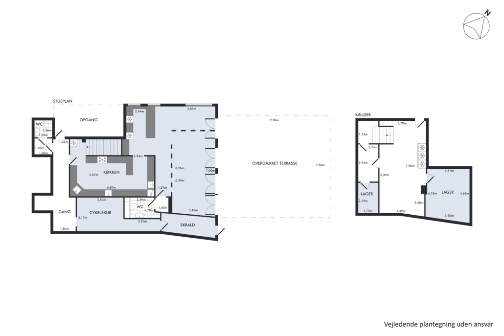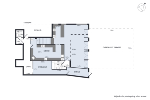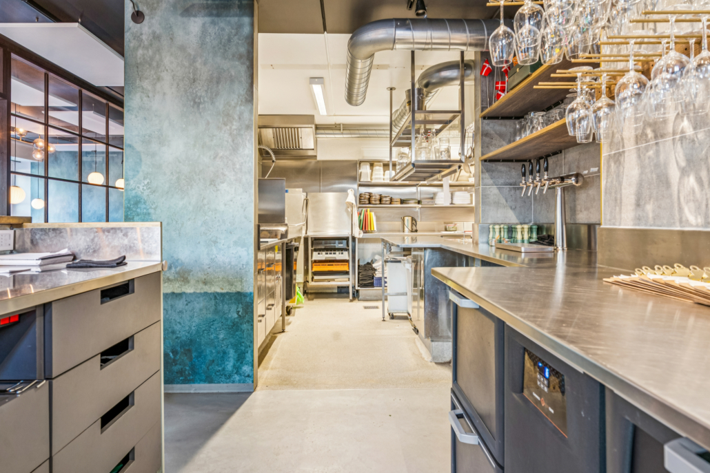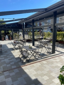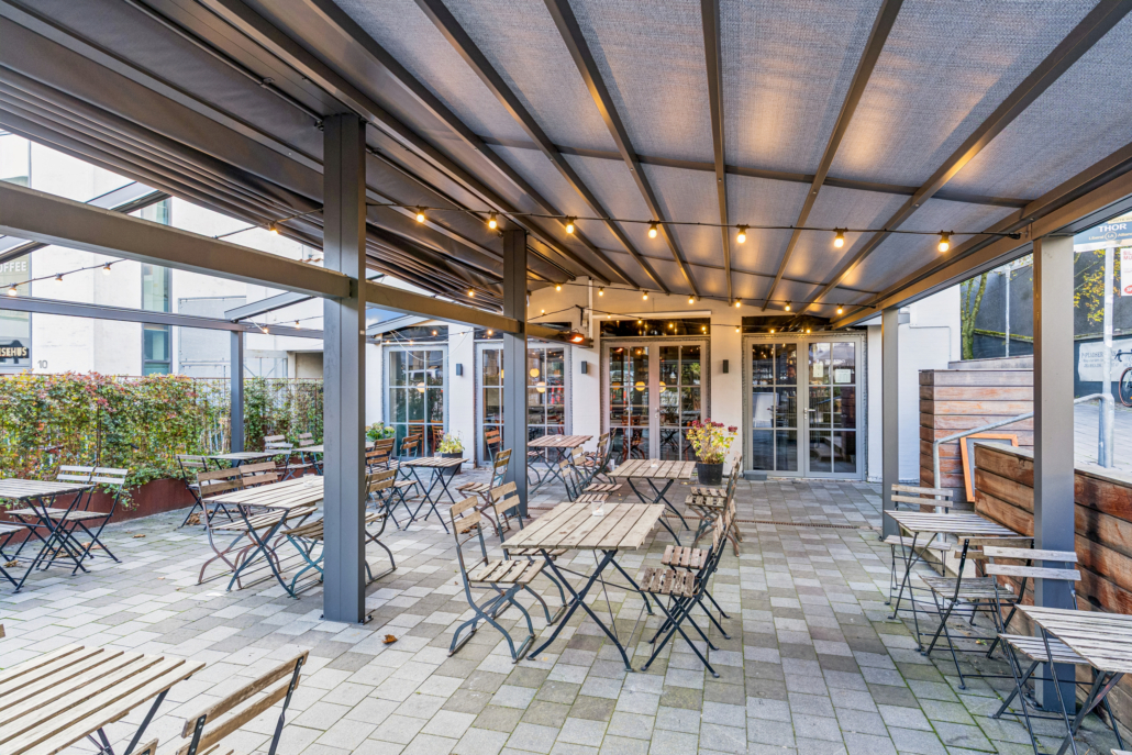 Udenfor venter en rummelig, overdækket terrasse med mange siddepladser. Her kan der serveres gennem det meste af året takket være overdækningen og muligheden for at installerer varmelamper – et kæmpe plus i et område, hvor udeservering er eftertragtet.