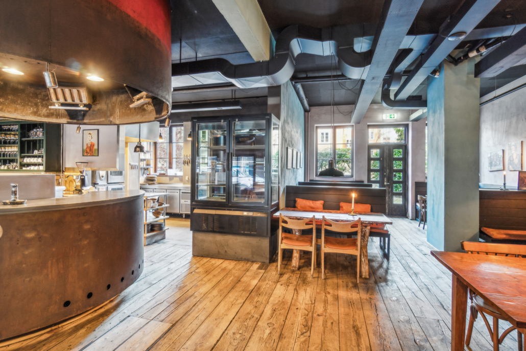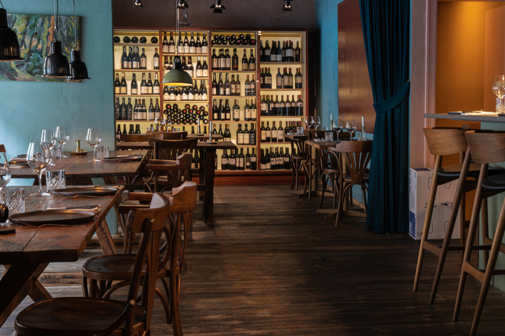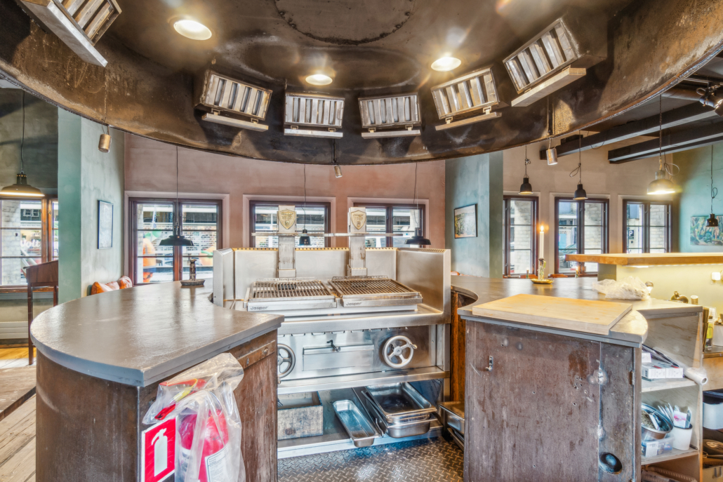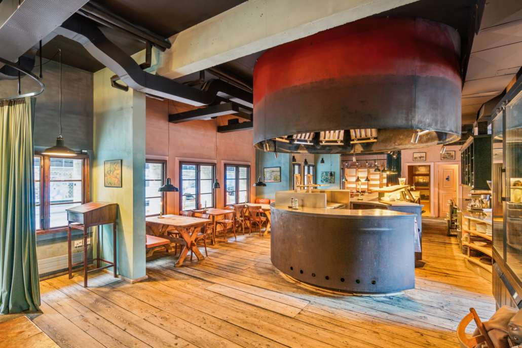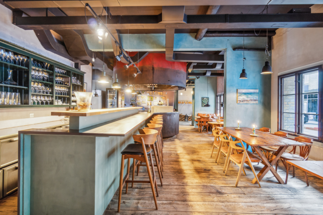 Restauranten er smukt indrettet i varme, naturlige nuancer, som skaber en indbydende og hyggelig atmosfære. Lokalet er gennemtænkt disponeret med et stort åbent køkken, der smelter sammen med restauranten og barområdet. Den markante grill placeret i serveringsområdet giver både gæsterne en unik oplevelse og personalet en inspirerende arbejdsplads.